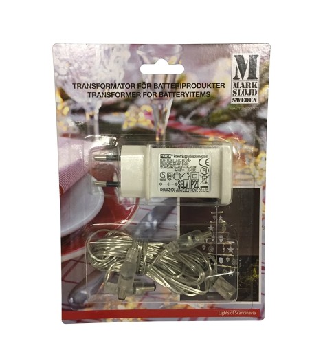 Denne transformer kan bruges til at erstatte batterier i f.eks. Elise Julestjerne (6248561389). Udover transformer med stik medfølger 3,5 meter ledning. Passer kun til Markslöjd produkter. (Læs mere)